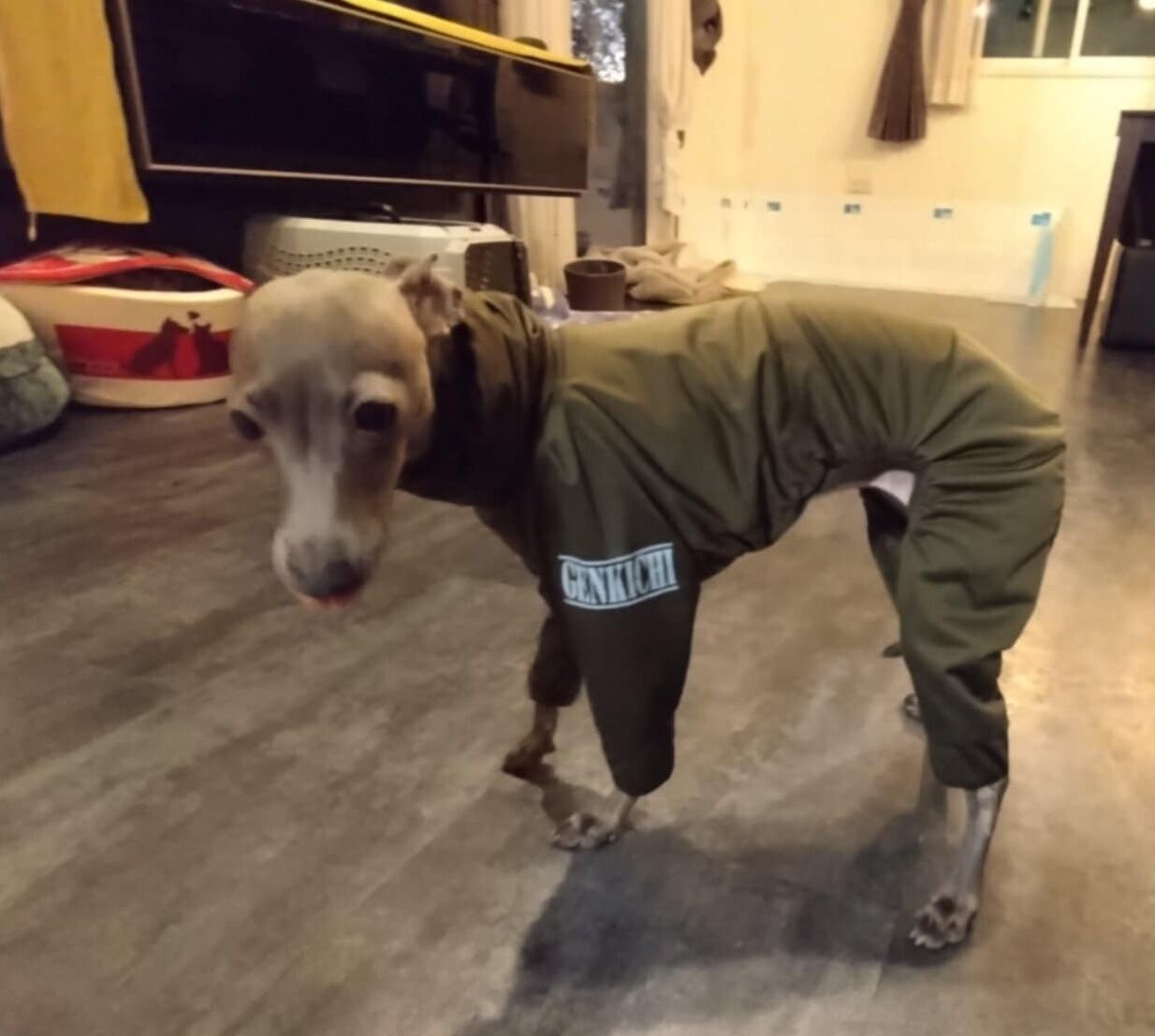 お部屋に戻り・・・取り急ぎ冬用の洋服を注文しようとサイズ確認のためゲンちゃんのお洋服を着せてみました。