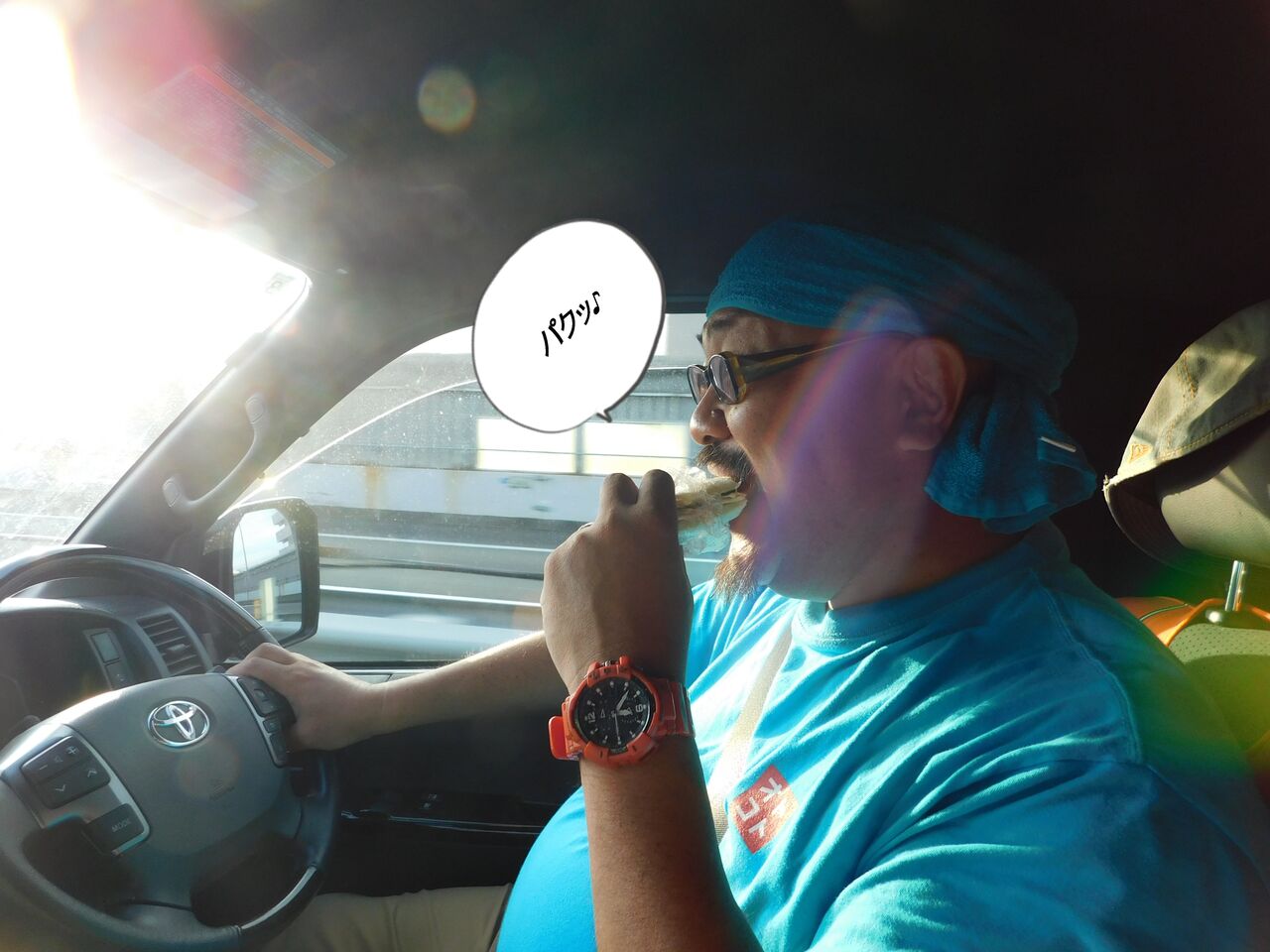 高速に乗ったところで朝ごはんにする頭ちゃん・・・